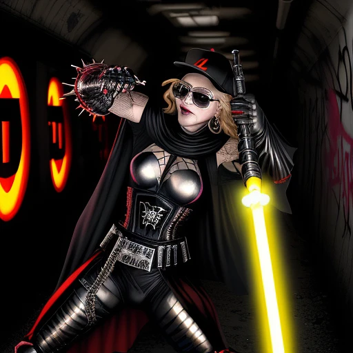 Madonna as a mummified demon priest who is apparently immortal is holding a lightsaber and is in a fight with A blackman, wearing a black baseball cap backwards, red sunglasses, in a black metallic dark knight armour suit with a yellow Z logo on and yellow cape who is also holding a lightsaber fighting with Madonna in a graffiti train tunnel.