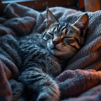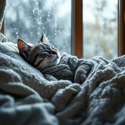 Animate a photorealistic American Shorthair cat sleeping indoors, breathing slowly and gently, with its body rising and falling. Add a soft purring sound. The cat is wrapped in a cozy blanket, lying by the window. Outside the window, it’s raining — raindrops fall slowly and hit the glass. Use cinematic lighting with soft shadows. Keep the scene calm and warm. No camera movement. Ultra-realistic style.