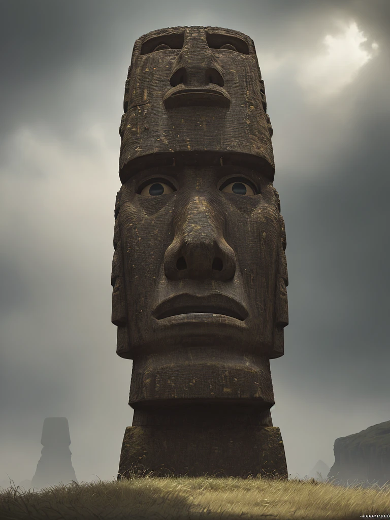 Photo of a ultra realistic moai, , dramatic light, cinematic lighting, battered, low angle, trending on artstation, 8k ultra HD, hyper realistic, focused, extreme details, unreal engine 5, cinematic, masterpiece, art by studio ghibli, intricate artwork by john william turner