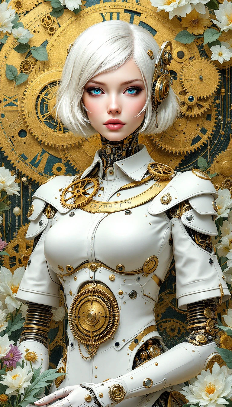 "Pearl Automaton in a Clockwork Garden": A dynamic abstract painting presents an automaton, with a blend of precision and a touch of ethereal beauty. She is a skilled construct, depicted in a fantastical garden where clockwork mechanisms and botanical wonders intertwine, with a porcelain complexion, short, platinum blonde hair, styled in a precise and symmetrical cut, and a layered, structured outfit with clockwork accents. Gears, springs and other mechanical components are connected to her limbs and are held in her gloved hands. The artwork combines modern abstraction and figure study, creating a compelling and intricate scene that uses tones of whites, silvers and golds. Her focused violet eyes, the composition's focal point, convey both a sharp intellect and a sense of purpose. After a night of careful maintenance and calculations, the automaton embodies both efficiency and a quiet and subtle elegance. The clean lines and detailed patterns invite the viewer to explore the hidden narratives within this vibrant work designed as a painting.
