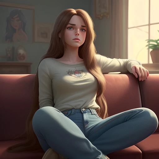 a woman, with long hair in jeans, sitting on a couch, in the style of cartoon realism, i can't believe how beautiful this is, cute and dreamy, disney animation, realistic hyper-detail, warmcore