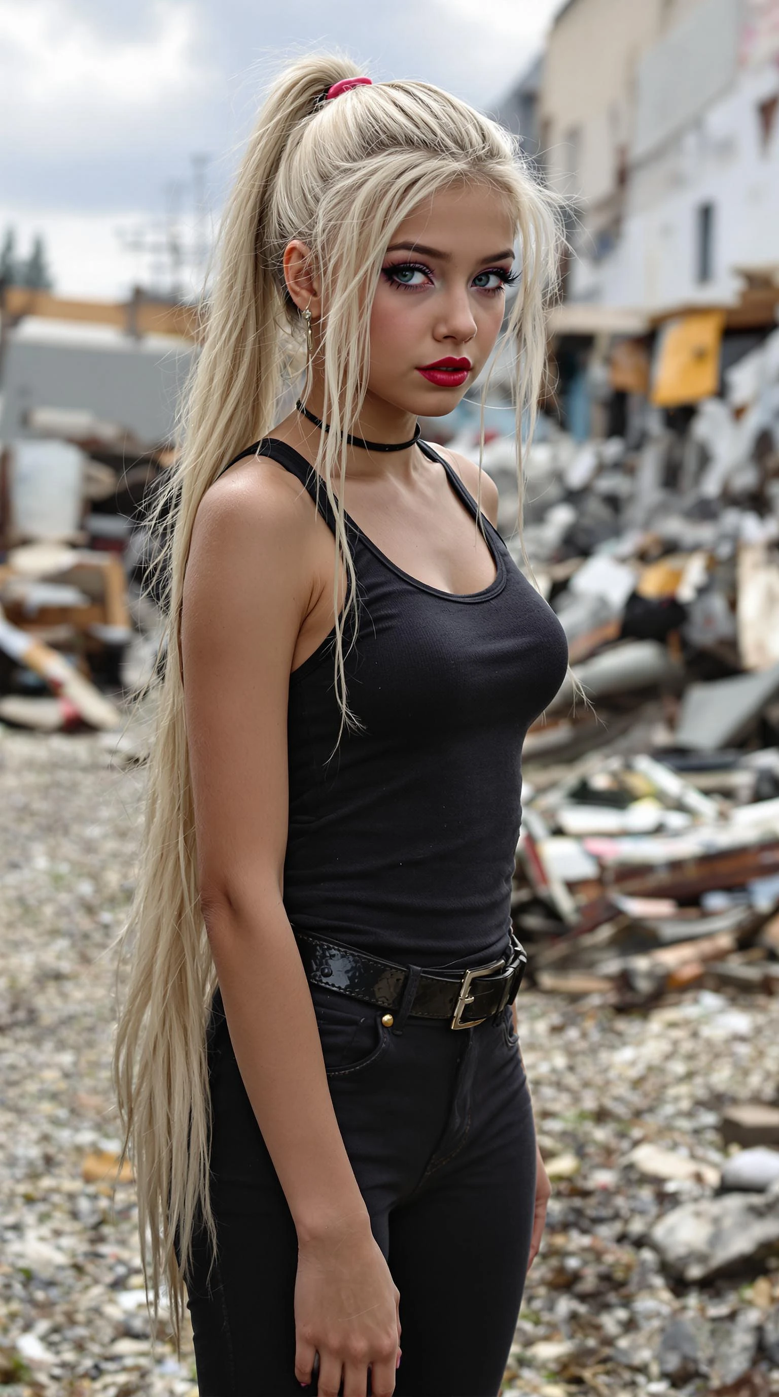 a professional photo of a exceptionally beautiful girl (tween) in the world, highly detailed, futuristic, (futuristic) , (masterpiece) , (realistic) , (perfect anatomy) , (Full body view) , (viewing from head to knees) with extremely long hair blonde hair, pulled back in to a ponytail, beautifully flawless olive skin, thick black eye liner, extra long eye lashes, light pink blush, extremely beautifully shaped lips with light red lipstick, light purple eye shadow, perfectly flawless olive skin, beautiful perfect high cheekbones beautiful perfect high cheekbones extremely detailed large perfectly shaped beautiful brilliant Forest Tea blue-brown-red-golden-grey-purple eyes, beautifully manicured fingernail with pink polish, (dressed in a black tank top, black skinny jeans) , (in the style of mad max) , standing in a waste lands junk yard, high depth of field, gentle expression, 8k, (high res) , ultra-detailed, photo-realistic, full image view, full body view, front view, highly detailed, volumetric, dramatic lighting