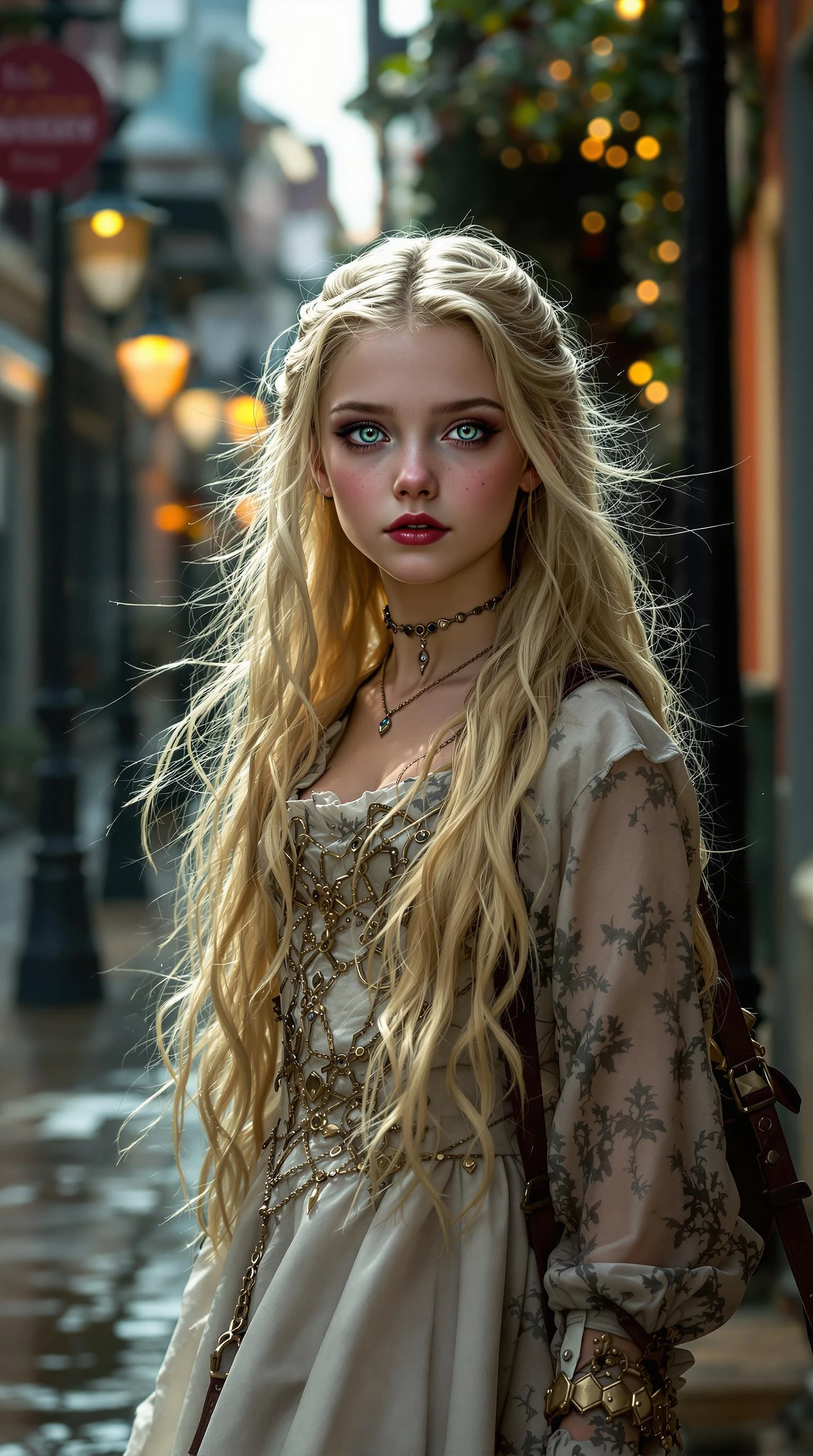 a professional photo of a eleven year old vampire girl, (Sara Howard) , (futuristic) , (masterpiece) , (realistic) , (perfect anatomy) with long blonde hair large beautiful brilliant Forest Tea red-green-blue-silver-brown-golden eyes, walking up Bourbon Street seventh century New Orleans dressed in the fashion The Vampire Diaries (8k) , (high res) , ultra-detailed, photo-realistic, front view, highly detailed, volumetric, dramatic light Perfect graphics, ultra-detailed, photo-realistic, full image view, full body view, front view