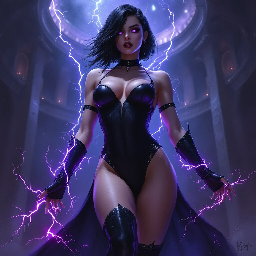 digital painting in the style of warhammer 40k of a female domina, standing infront a gothic circh, channeling lightning magic, cybereyes, black ultra tight onepiece bathsuit, black sidecut hair, very big tits