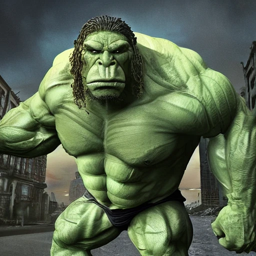 photo of an enormous muscular orc bigger than normal people with green skin flexing his huge pecs and biceps with huge veins on muscles on ruined city, people around being shocked, extreme quality, light on muscles, 4k quality,
