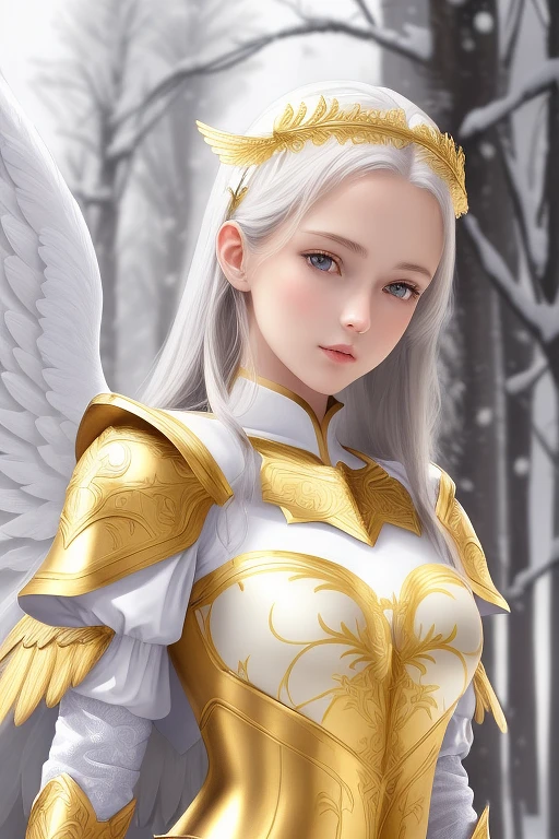Beautiful young girl. (In full growth.) Slender body. ((A girl in snow-white armor with golden patterns. Behind him are the white wings of an angel.) )Correct proportions. Realistic face. Beautiful eyes. Detailed face. Detailed eyes. Realistic. High quality picture. Detailed picture. Masterpiece. ArtStation. A high resolution.