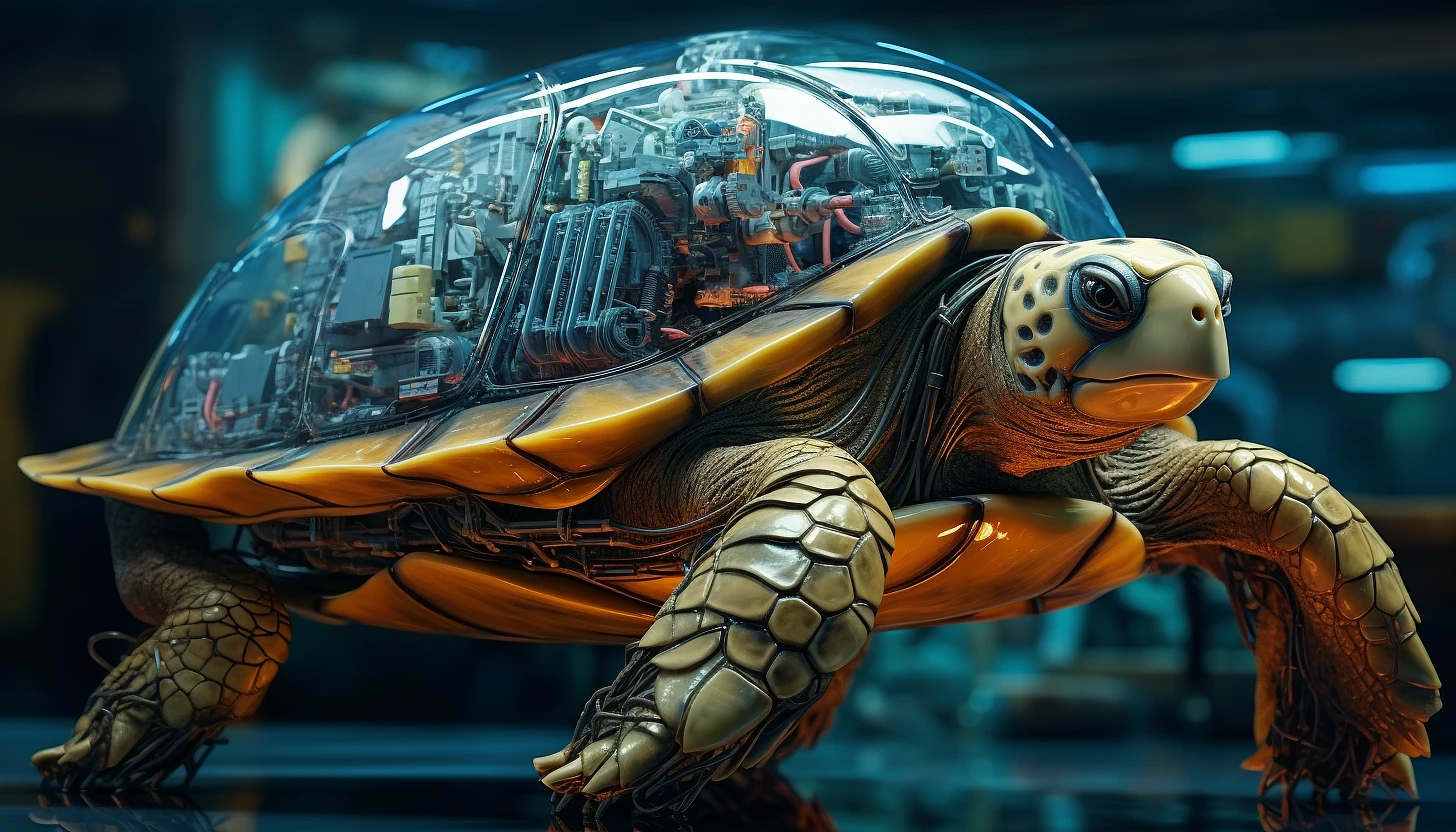 A giant turtle with a transparent carapace show intricate mechanical spears, reality, high resolution, real skin --ar 7:4 --v 5. 2