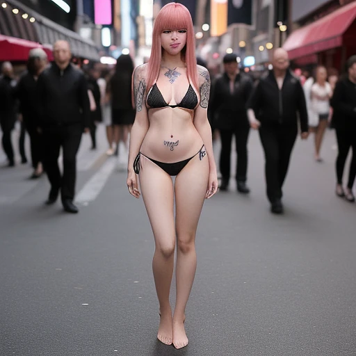 young woman with bangs, long pink hair wearing black micro bikini stands on a crowded street in New York. She has an a blushing expression, looking directly at the camera. Full body. Long legs. She is 200 lbs. she has intricate tattoos on her torso down to her stomach. non NSFW.