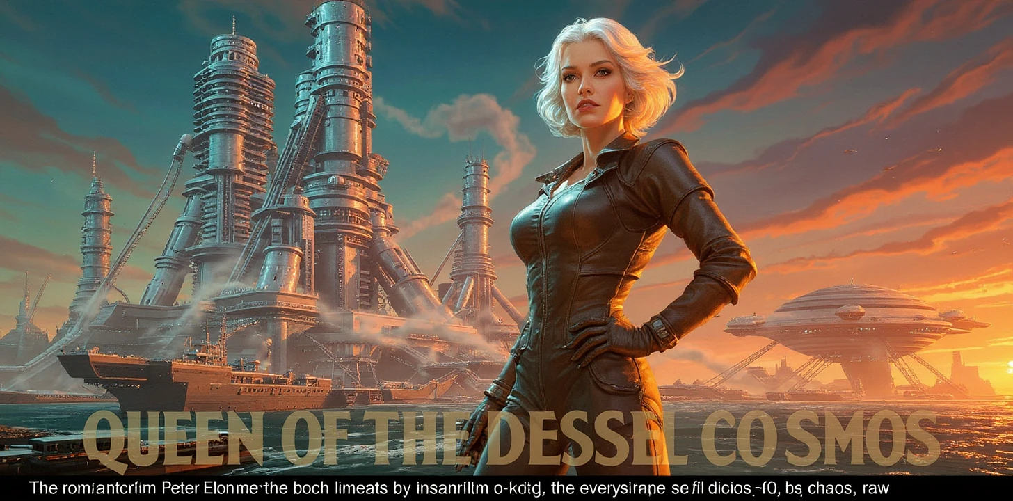 A 1970s sci-fi book cover illustration in the style of Syd Mead meets Chris Foss. A striking European woman with platinum white hair poses heroically in a dieselpunk flight suit. Behind her, a sprawling retro-futuristic cityscape erupts with massive piston-driven skyscrapers, Art Deco neon towers, and floating dockyards spewing smoke into a candy-colored sky (muted teals, burnt oranges, and mauves) . Key 70s cover elements: Airbrushed gradients with visible brush texture Dramatic lens flare across chrome surfaces Vintage sci-fi tropes: Syd Mead precision in every gear and girder Style: "The romanticism of Peter Elson meets the technical rigor of Mead, with bold 70s typography overlay (imagine a title like 'Queen of the Diesel Cosmos' in vintage font) . " Technical: --ar 4:5 --stylize 900 --v 6. 1 --chaos 30 --style raw