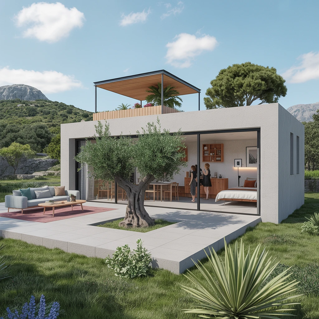 The plan of a small energy autonomous house 25m². Open patio with an olive tree in the centre. The other spaces will be livingroom, bedroom, and a working space for a young couple. Open spaces, storage, loft.