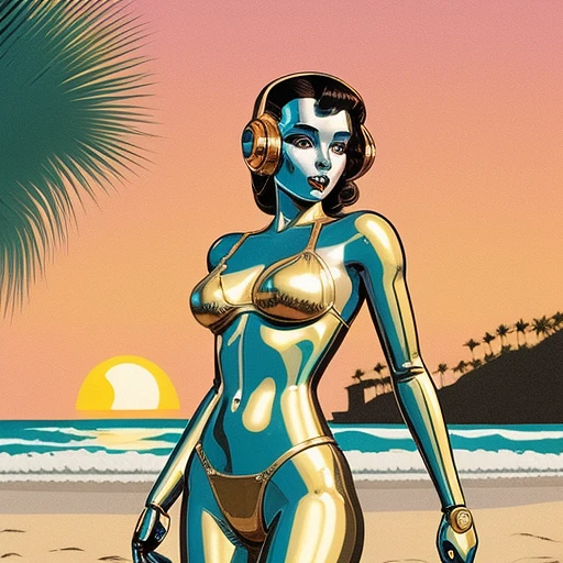 80s chrome and steel Retro Sunset, golgen hot robot girl in bikini, water, gold, illustration, inspired by James Jean 80s chtome and steel Retro Sunset, beach and palms scene, green, gold, illustration, inspired by James Jean, variation
