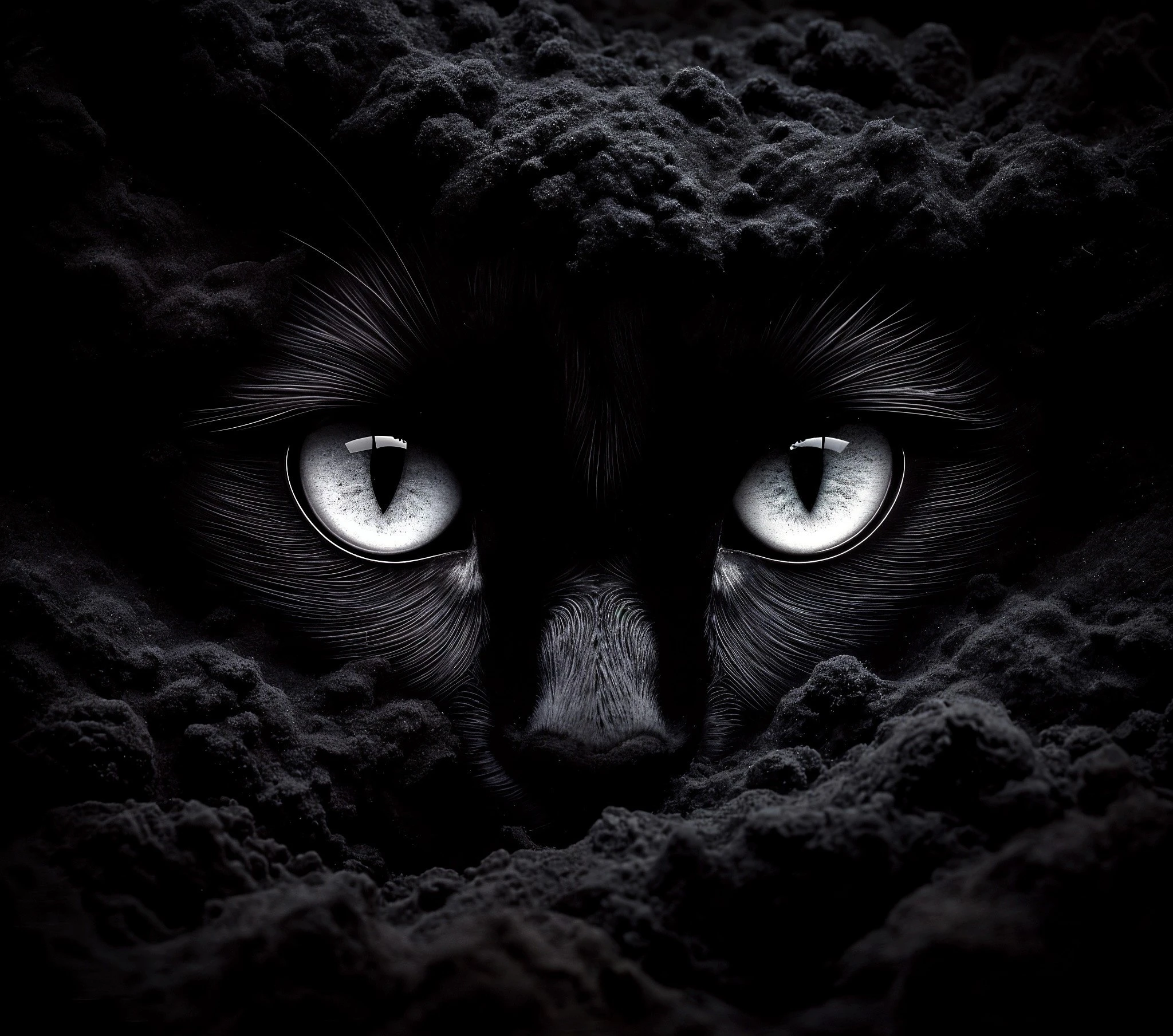 A captivating and intriguing photographic portrait, showcasing the pure and enigmatic darkness of Vantablack material. The composition expertly highlights the striking contrast between the obscurity and the piercing gaze of a cat's eyes, emanating from the depths of the blackness. The image masterfully blends artistic and technical techniques, resulting in a beautiful and realistic representation of the concept