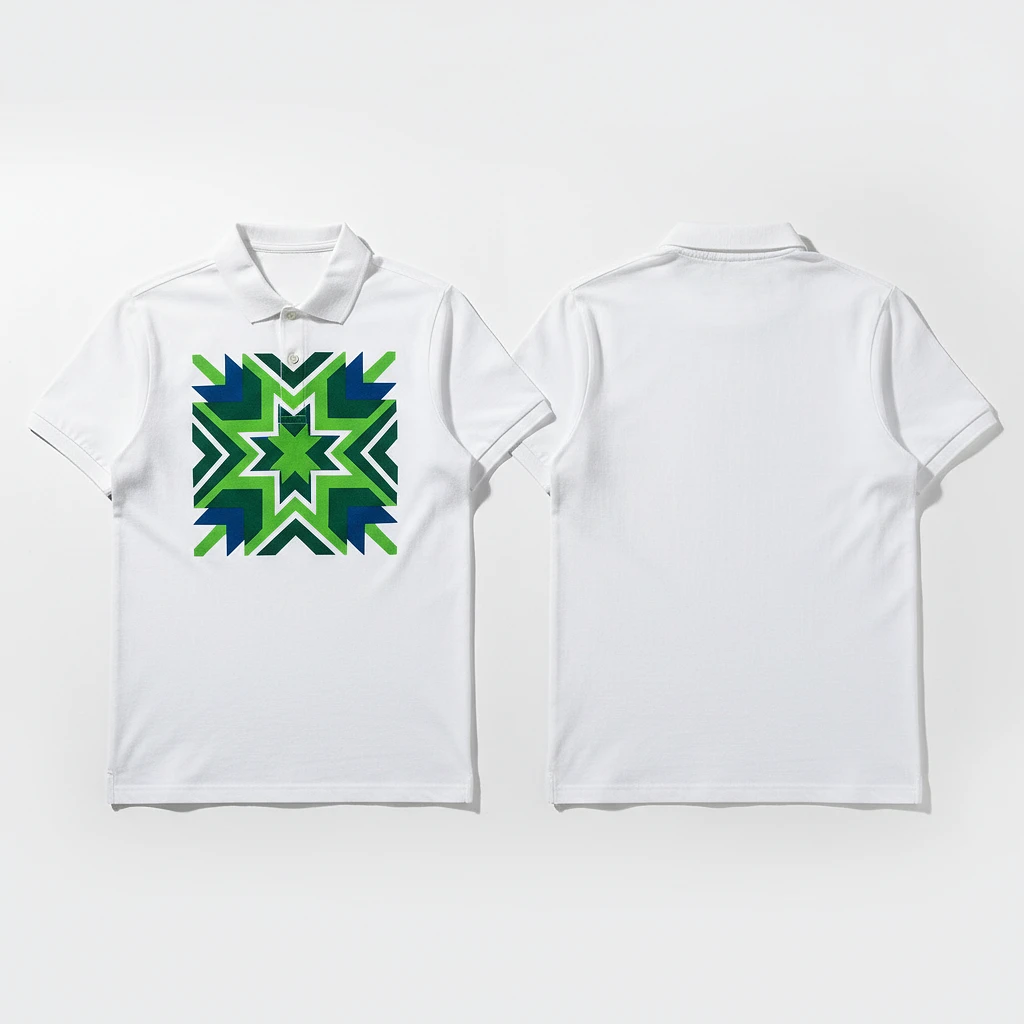 back and front polo shirt White cotton t-shirt laid flat on a pure white surface, clean overhead lighting, subtle shadow geometric graphic in green-white-blue with heavy emphasis on green; simple angular forms, strong symmetry, generous negative space. No branding, no tags showing, editorial product style.