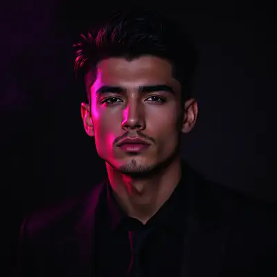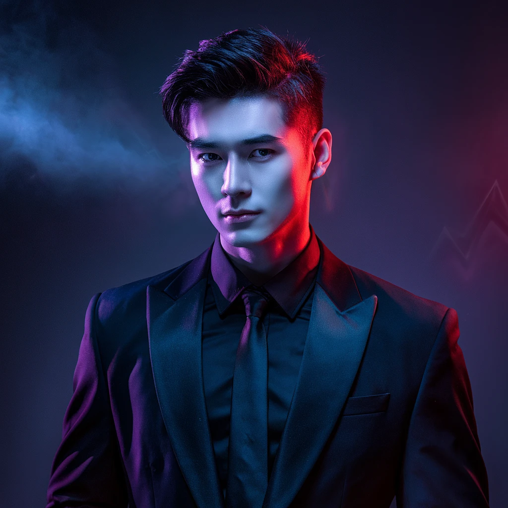 "A young man with sharp facial features, styled black hair, and a confident yet mysterious expression. He is dressed in a sleek black suit with a black shirt and tie. The lighting is moody, with a deep purple and red glow highlighting one side of his face. The background is dark with a soft, atmospheric effect, adding a sense of intrigue. The overall aesthetic is stylish, modern, and enigmatic, resembling a crypto expert or financial trader persona. "