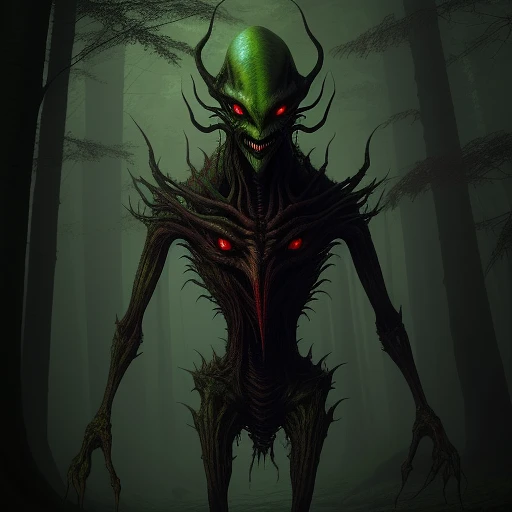 Full body photo of a scary alien creature that looks like a ship from a forest, green deadly red eyes, horror, golden skin,
