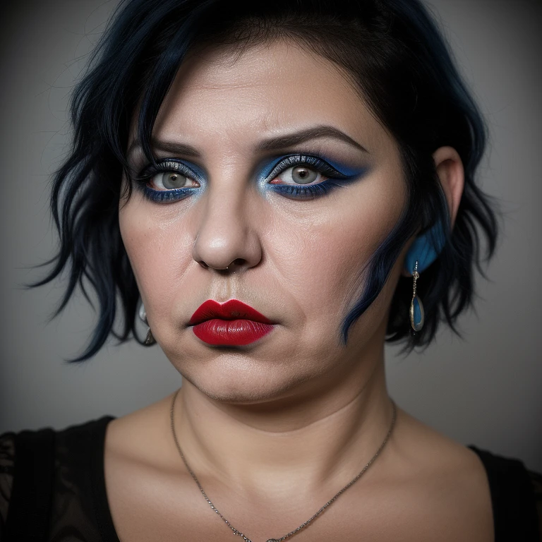hyper realistic headshot photo of a 40 year old italian, punk woman, slightly overweight, short black hair, red lipstick and blue eyeshadow, expensive jewelry, she has a depressed look, looking into the camera, ultrarealistic, soft lighting, 8k