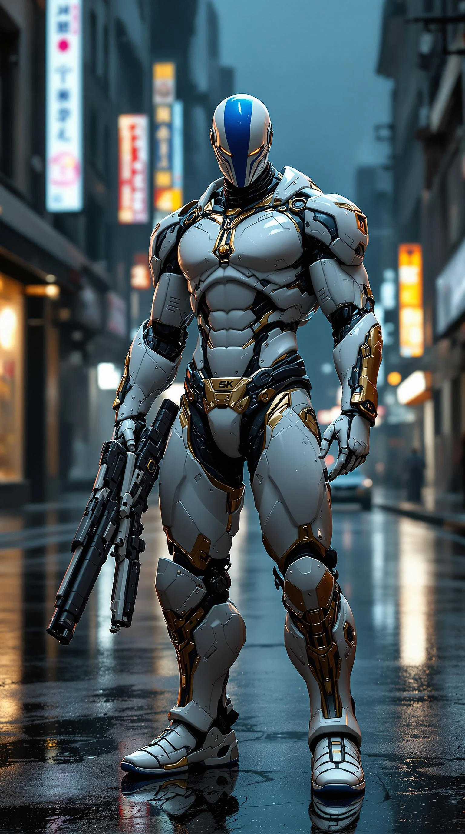 porcelain white with blue paint and gold , cyber, 8k, ultra realistic, cyborg, transhumanism, futuristic, warrior, bald head, mask, standing stoic, in the dark dystopian city, the concrete is wet and his reflection appears. Have him holding a large mecha machine gun, gears of war. Blade runner color palette.