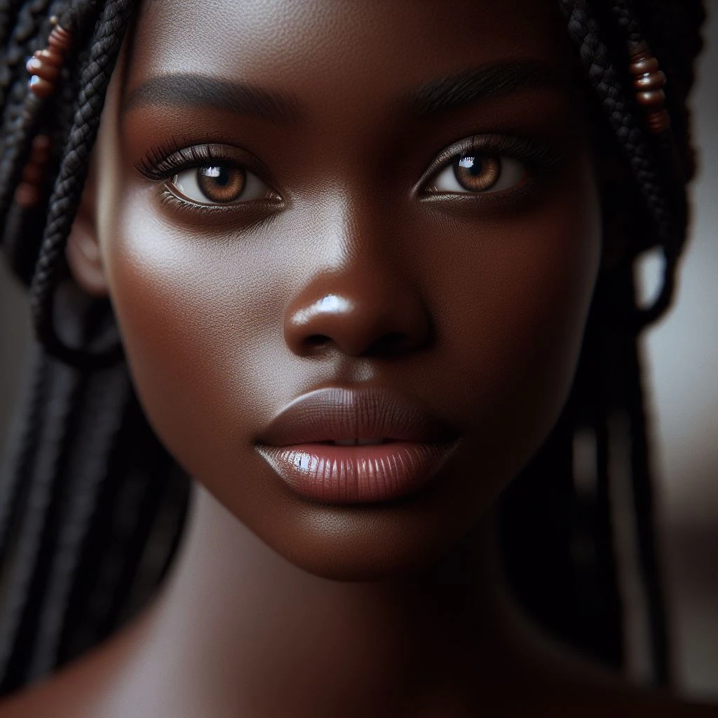 Portrait of a young woman with ebony skin, intricate beaded braids. Serene, wise expression with a captivating intense gaze. Extreme close-up on the subtle details of her skin, lips, honey-colored eyes. Hyperrealistic 16K render with incredible depth of field. Soft, natural lighting flattering her features