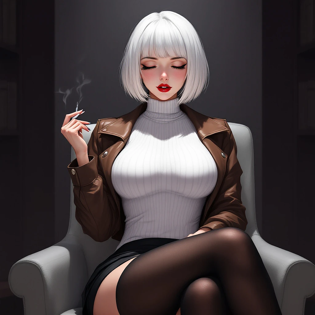 anime, woman, white hair, bob cut, closing eyes, freckles, red lips, white sweater, tight sweater, short leather jacket, brown leather jacket, black tight skirt, black stockings, black high heels, sitting on a chair, sitting with legs crossed, big chest, smoking cigarette