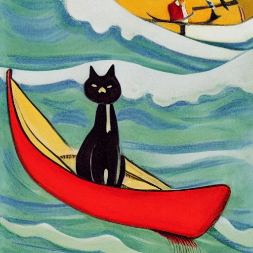Tove Jansson color style illustration : : black cat in the kayak in the storm, big waves around