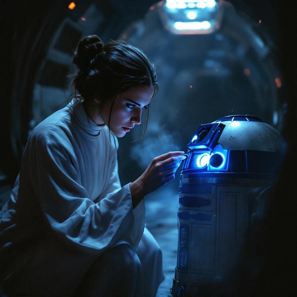 "An ultra-detailed, cinematic scene of Princess Leia Organa crouched closely beside R2-D2 in the dark, smoke-filled corridor of the Tantive IV. The camera is tightly framed, focusing on Leia’s intense, determined face as she slides a small silver data disk into R2-D2’s glowing blue compartment. The faint blue light from the droid’s open slot softly illuminates her features, casting a ghostly glow on her white gown and iconic cinnamon-bun hairstyle, which are barely visible in the deep shadows. The oppressive atmosphere is palpable: the corridor is filled with drifting smoke, faint sparks falling from damaged panels, and the distant echoes of blaster fire. The limited light sources flicker sporadically, creating dynamic, eerie shadows that emphasize the tension and urgency of the moment. Leia’s hand briefly rests on R2-D2’s weathered metallic dome, which reflects the dim blue light from the disk slot. The astromech droid emits soft, urgent beeps, his dome swiveling to face her, their connection captured in this fleeting moment. The background is obscured by darkness and swirling smoke, with only hints of the ship’s damaged walls and emergency lighting visible. The composition emphasizes the close bond between Leia and R2-D2, with every detail—from the faint glow of the disk slot to the subtle reflections on the droid’s surface—crafted to highlight the tension, secrecy, and high stakes of Leia’s mission. The scene captures the raw, gritty aesthetic of the Star Wars universe, blending dramatic lighting, photorealistic textures, and immersive atmosphere. " Clutching a small silver data disk, her movements are deliberate and urgent. The soft, metallic hiss of R2-D2’s compartment opening cuts through the tense silence as Leia works quickly. The glowing slot in the astromech droid’s body casts a faint, ethereal light onto her face, highlighting her determined expression amidst the darkness. R2 chirps softly, the tones laced with urgency, as Leia carefully slides the data disk into place with a quiet click. ‘You must take this to the Rebel Alliance, ’ she whispers, her voice low and steady despite the chaos around her. ‘It’s our only hope. ’ Her hand briefly rests on R2’s dome, a fleeting moment of resolve and connection, before she glances over her shoulder. The faint glow from the data slot reflects off the droid’s metallic surface, illuminating wisps of drifting smoke and emphasizing the oppressive gloom. The distant sound of stormtroopers’ boots grows louder, the rhythmic pounding filling the silence. Leia straightens quickly, her gown trailing behind her as she steps back into the darkness. She disappears into the shadows, her figure vanishing into the smoky, dimly lit corridor, leaving R2-D2 to roll forward with purpose. The environment is oppressive and atmospheric, dominated by deep shadows and the faint glow of emergency lighting. Sparks occasionally flicker from damaged panels, briefly illuminating the twisted bulkheads and dense smoke. The scene captures the dire urgency and iconic Star Wars aesthetic, emphasizing the tension and secrecy of Leia’s mission in a dim, claustrophobic setting. "