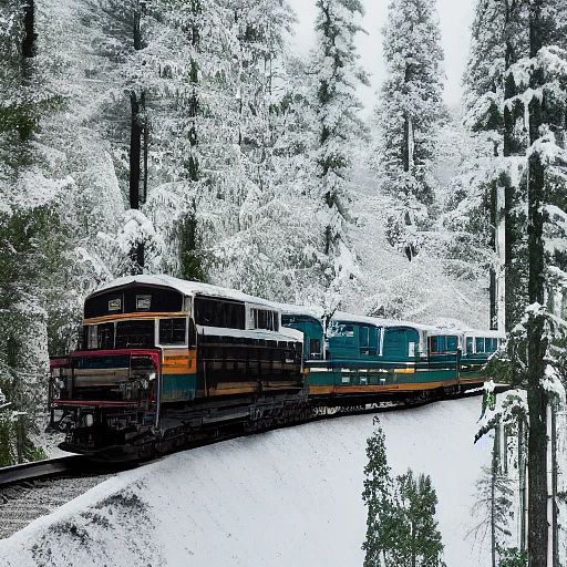 High resolution photograph of a Chepe train, inside a snowy forest, seen from the side, with 6 wagons,