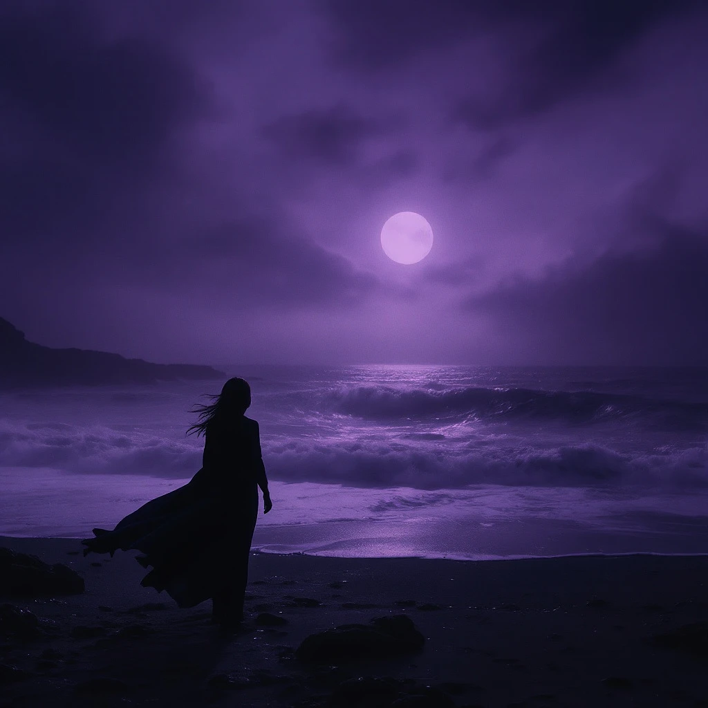 a dramatic, cinematic scene at a moonlit coastline, one lone figure standing at the edge of the sea, back facing the viewer, wind blowing a long coat or dress, silver moonlight reflecting on the waves, atmospheric fog, purple and indigo color palette, soft glowing mist, emotional and poetic, subtle lens flare, high-resolution, film still style, James Bond intro mood, wide aspect ratio, artistic album cover composition, –v 5 –ar 3:4 –style cinematic –q 2