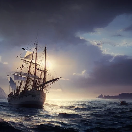 Photo of a ultra realistic sailing ship, dramatic light, pale sunrise, cinematic lighting, battered, low angle, trending on artstation, 4k, hyper realistic, focused, extreme details, unreal engine 5, cinematic, masterpiece, art by studio ghibli, intricate artwork by john william turner