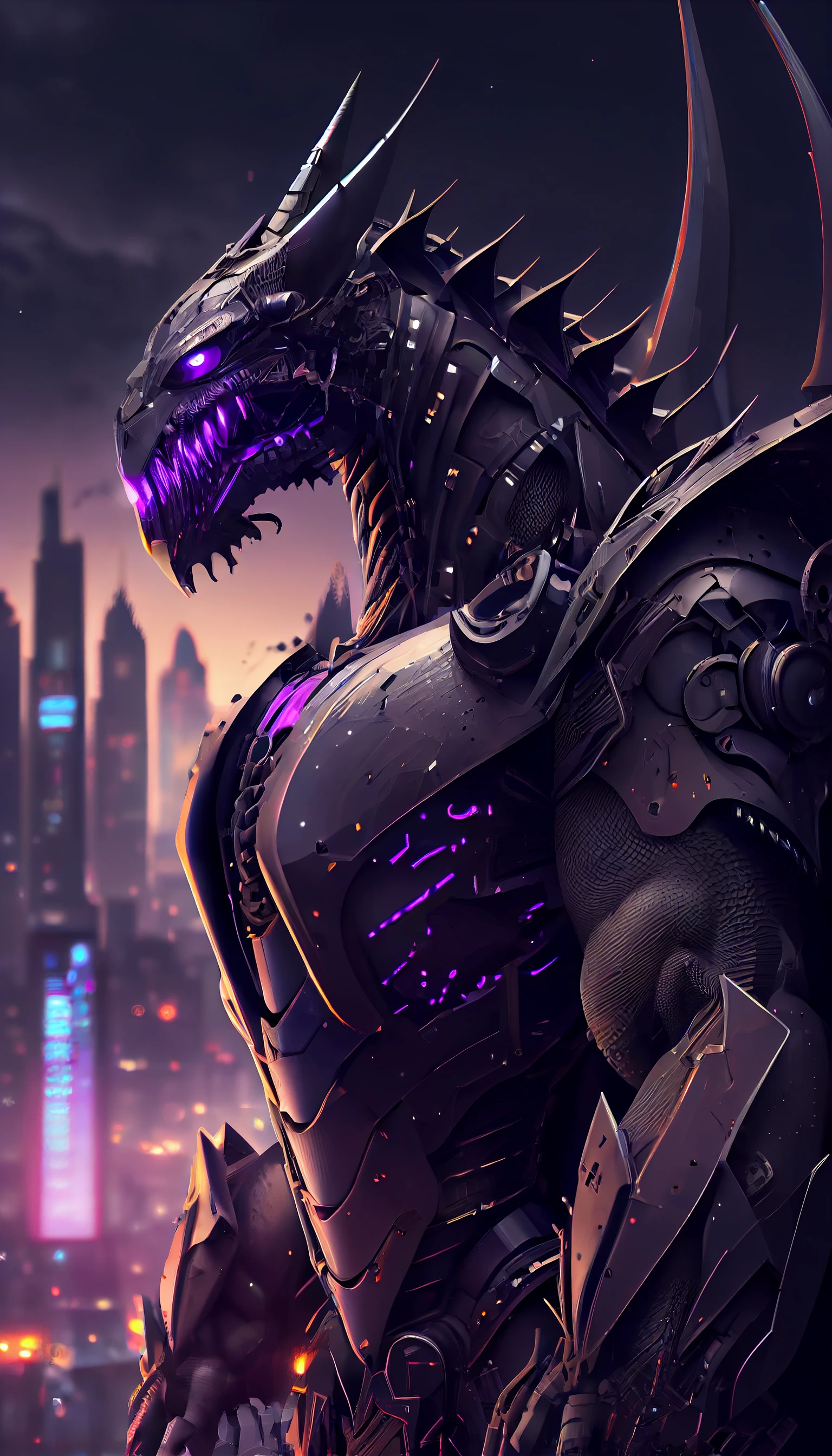 A Realistic illustration of a giant black dragon robot with neon purple eyes in a burning futuristic city background, night time with a crescent moon, cinematic composition. 8K render, 4K HDR, hyper realistic. --ar 9:16 --upbeta --v 4