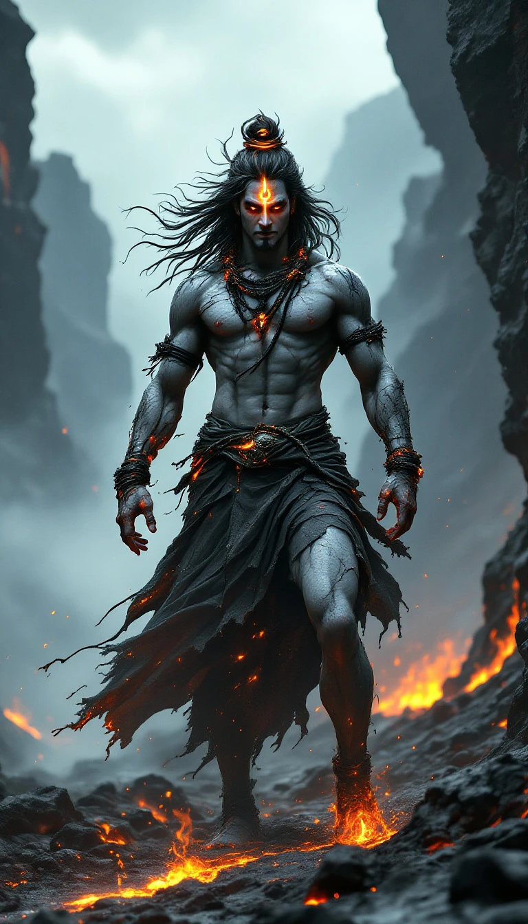 A divine and ethereal depiction of Lord Shiva, standing fiercely in a desolate volcanic landscape, surrounded by jagged black rocks and molten rivers of lava. His presence is both mesmerizing and formidable, embodying the untamed force of nature. Shiva's stance is dynamic and intense—one foot planted firmly on scorched ground, his muscular torso twisted with arms spread wide in a commanding pose of defiance and power. His glowing, third eye radiates an intense, fiery light, symbolizing destruction and transformation. Shiva's ash-smeared body is partially clad in tattered, burnt fabric that clings to him in charred strips, smoldering at the edges as embers flicker along the seams. The scorched remains of his attire expose much of his muscular frame, adding to his raw, untamed aura. Ash and soot streak his skin, blending with smudges of sacred vibhuti (holy ash) , accentuating his divine presence. Molten lava flows from his fierce, unblinking third eye like a river of glowing fire, streaming down his forehead and face, illuminating his sharp features with a brilliant red-orange glow. The molten flow radiates intense heat, distorting the air around him and sending smoky trails upward like a fiery aura. The volcanic ground pulses with fiery veins of lava beneath the surface, casting a dim, red glow that reflects through the low-lying mist and smoke swirling at his feet. In the background, towering cliffs of jagged black rock stand under a stormy sky, with faint embers drifting through the air like sparks from a cosmic fire. Above Shiva’s head, a radiant golden trident (Trishul) glows with divine energy, surrounded by orbiting symbols of ancient wisdom, including Sanskrit mantras, sacred geometric patterns, and mystical yantras. The symbols pulse rhythmically with Shiva’s energy, casting a powerful aura of cosmic knowledge and spiritual strength. The air is filled with drifting embers and glowing particles, swirling like fiery snowflakes, their motion enhanced by the shimmering heat rising from the molten earth. Shiva’s expression is calm yet intense, his gaze unwavering — the embodiment of destruction, creation, and eternal power. **Rendering Style:** Hyperrealistic, UHD, 8K, 16K, ultra-detailed with dramatic ambient lighting, strong depth of field, natural bokeh, and diffused light effects. The image should evoke a sense of power, divinity, and cosmic energy, blending raw elemental force with divine presence.