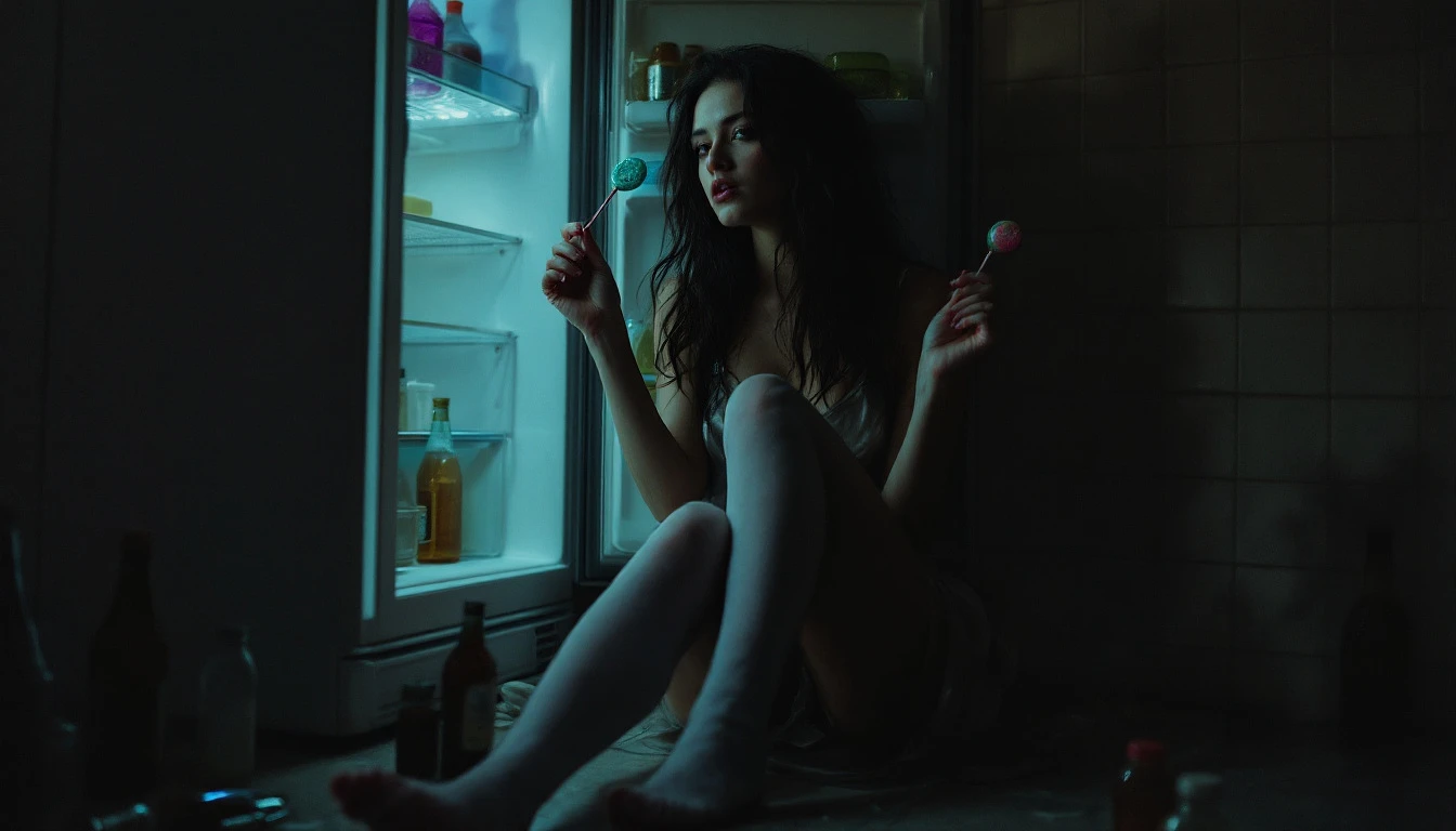 Realistic Photo of A moody scene featuring a young woman with long, messy dark hair sitting in front of an open fridge late at night. She is wearing a satin nightdress and thigh-high socks, holding a bottle in one hand and a lollipop in the other, with a contemplative and slightly rebellious expression. The floor around her is scattered with various bottles. The kitchen has a tiled wall, and the overall atmosphere is dimly lit, creating a sense of late-night solitude and mystery