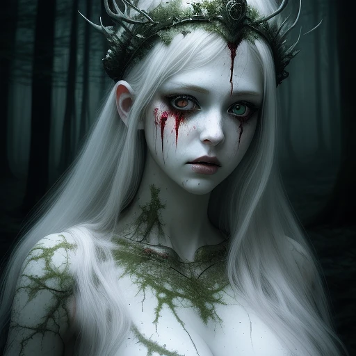 beautiful stunning ethereal white female, eerie forest queen, blood splatter, photorealistic, ultra detailed, lighting, hdr. --ar 9:16