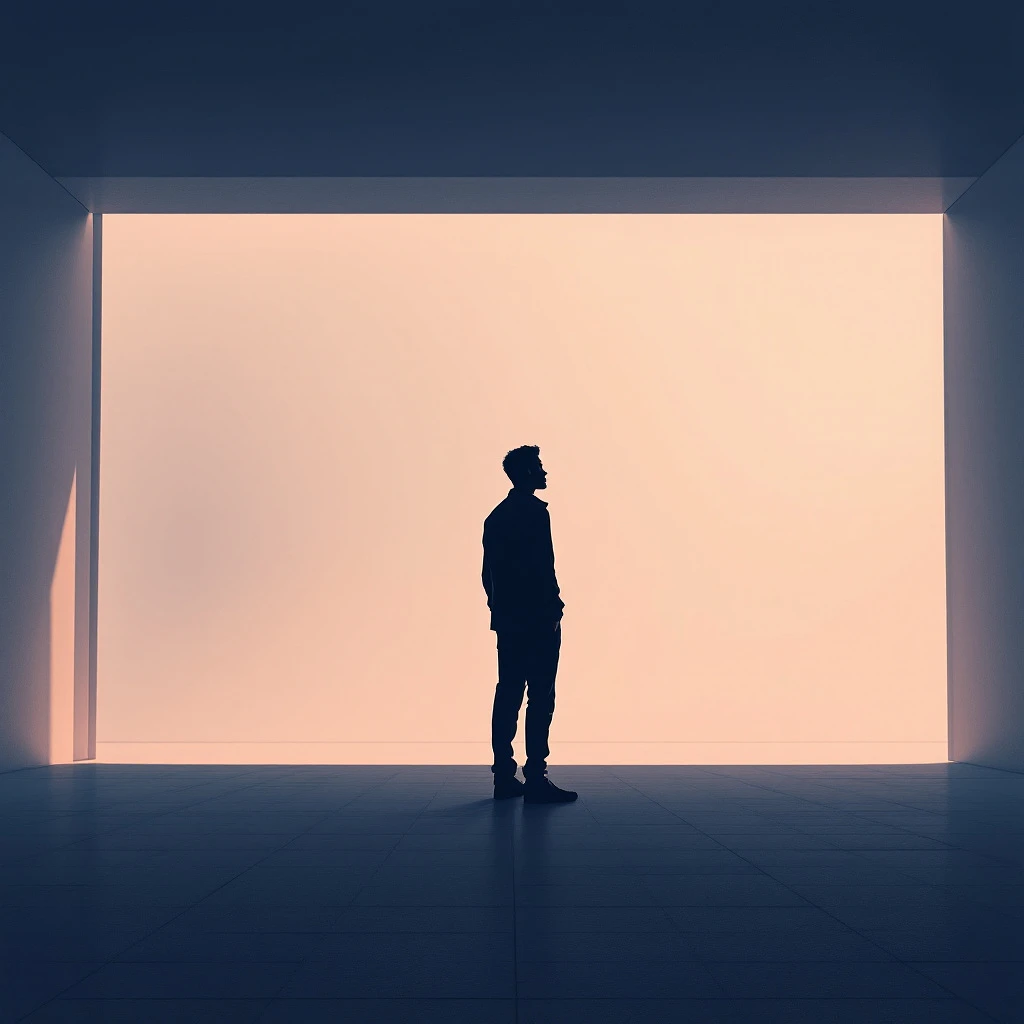 contemporary, minimalist, wide, one subject, centered, digital illustration, wide angle, head-on, low contrast, solitary man in silhouette, mid-thirties, dressed in a simple, modern outfit, his posture relaxed and introspective large, softly lit space with navy and soft white, environment is sparse and open, emphasizing solitude and contemplation, soft gradient from warm tones, creating a tranquil and ethereal atmosphere focus on the subtle interplay of weak light and shadow on the subject and surroundings, focus on texture and ambient light --ar 9:16 --style raw --v 6. 1
