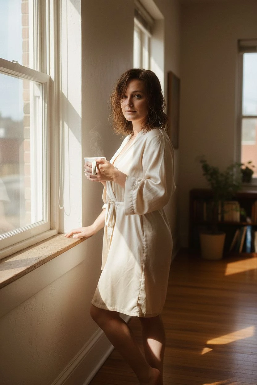 the uploaded woman, sparsely dressed, wet hair, stands by a sunlit window, the morning light spilling across her gentle curves. In one hand, she holds a warm cup of coffee, the steam curling softly upward, while her other hand rests lightly on the windowsill. Behind her, the room is bathed in warm tones, with soft shadows playing across textured walls and scattered morning light reflecting off polished wooden floors. hyper-realistic, photorealistic with no cartoon, anime, CGI, or painted effect. Cinematic frame in 2. 39:1. Shot with a 50mm lens, shallow depth of field, soft bokeh. Lighting is warm. Color grading with soft tones, desaturated background, dreamy glow using a Pro-Mist effect.