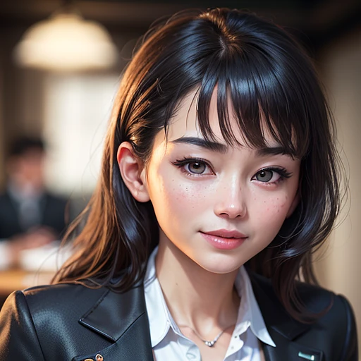 (masterpiece:1.0) , (best quality:1.4) , (ultra highres:1.2) , (photorealistic:1.4) , (8k, RAW photo:1.2) , (soft focus:1.4) , 1 woman, posh, (sharp focus:1.4) , (korean:1.2) , (american:1.1) , detailed beautiful face, black hair, (detailed open blazer:1.4) , tie, beautiful white shiny humid skin, smiling