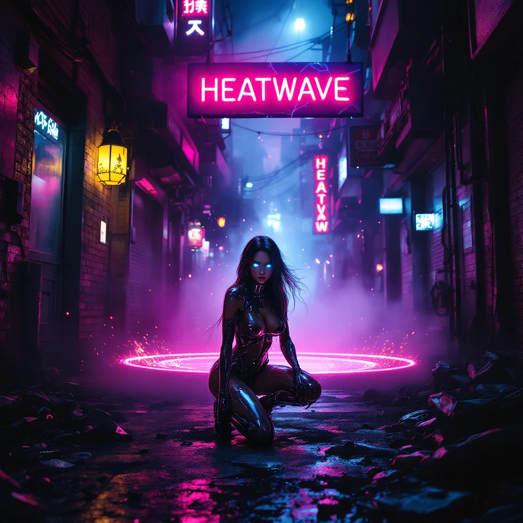 A hyperrealistic 8K cinematic scene set in a dark, neon-drenched alleyway that blends the gritty streets of 1980s Tokyo with a cyberpunk future. The atmosphere is alive with swirling fog, trash-strewn ground, and flickering neon lights casting erratic glows onto the weathered brick walls. A cracked neon sign reading "HEATWAVE" buzzes and falters, illuminating the chaotic scene in pulses of vivid pink and blue. At the heart of the action stands a stunning female android combatant from the future. She crouches on one knee within a glowing circle of light, her sleek metallic body gleaming with intricate, photorealistic details. Her long, flowing hair moves as if caught in a gentle breeze, while particles of light and sparks from a massive discharge behind her swirl in the smoky air. Her piercing blue glowing eyes lock onto the viewer, exuding an aura of power and readiness. The tension heightens as the Ghostbusters stand nearby, their proton streams arcing through the fog, battling Gozer the Gozerian, whose massive, otherworldly presence looms in the distance. Burning cars, shattered glass, and smoldering debris litter the alley, enhancing the chaotic scene. A telephone booth with shattered panels leans against a graffiti-covered wall, while rusted dumpsters and trash cans overflow, spilling refuse across the wet pavement. This masterpiece captures the gritty, chaotic intensity of an 80s action-drama fused with high-tech cyberpunk fantasy. The dynamic composition, vibrant neon hues, and dramatic lighting create an unforgettable cinematic experience that immerses the viewer in a world of supernatural battles and futuristic intrigue.