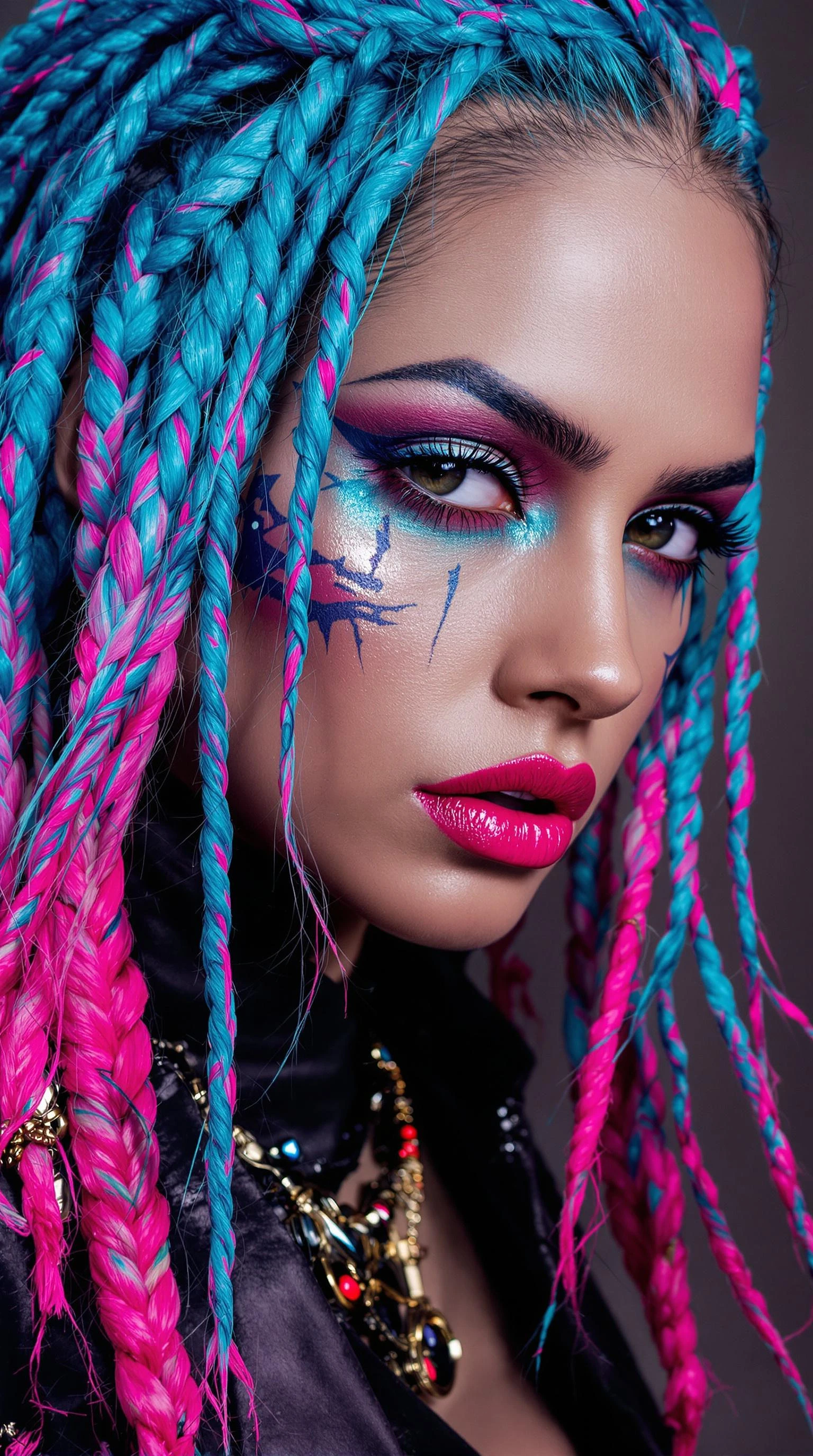 a portrait of a woman with blue and pink braided hair, heavy metal comic cover art, stylized beauty portrait, visually striking, πŸ’‹ πŸ’„ πŸ‘  πŸ‘—, dreampunk romanticism artwork, comicbook, quivering lips, sadistic, female beauty, too blue, red fuchsia and cyan, high definition art