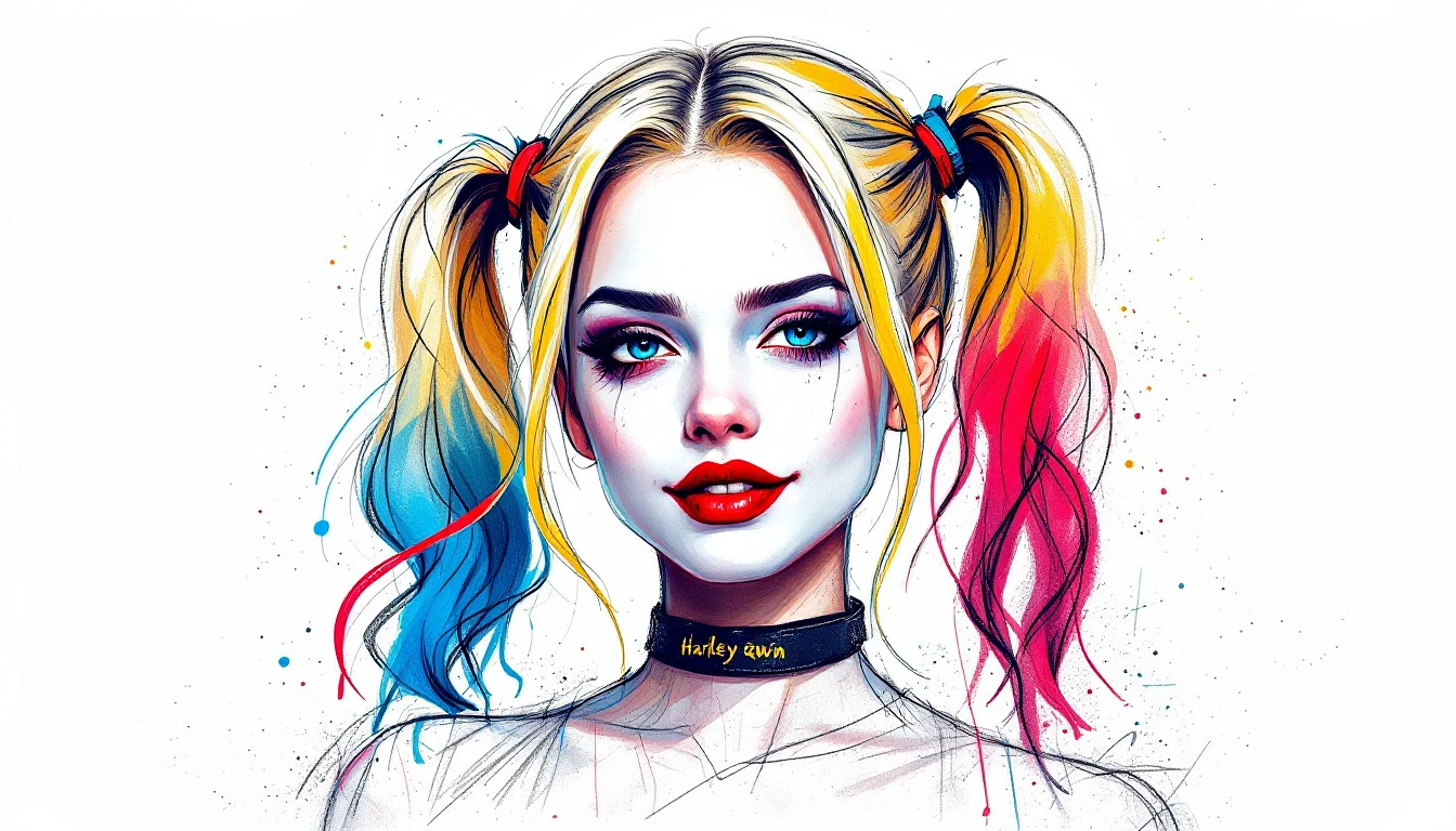 Colorful hand-drawn sketch, dynamic angle, and randomized view. Minimalist aesthetic on a pure white background with subtle graffiti textures. Harley Quinn with detailed eyes, smooth skin, and abstract hair. Textured pencil strokes with expressive, abstract lines and vibrant colors, blending with the white background. Subtle creases and folds on her outfit. The viewer's perspective is slightly tilted, as if looking up at Harley, adding a sense of drama and playfulness to the scene