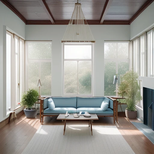 High resolution photography interior design, dreamy sunken living room conversation pit, wooden floor, small windows opening onto the garden, bauhaus furniture and decoration, high ceiling, beige blue salmon pastel palette, interior design magazine, cozy atmosphere; 8k, intricate detail, photorealistic, realistic light, wide angle, kinkfolk photography, A+D architecture