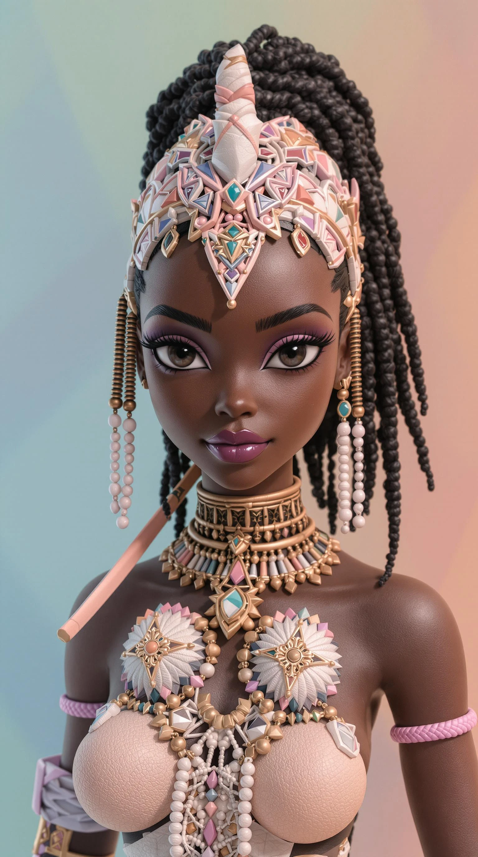 beautiful fit and slim dark skinned African ebony warrior princess Horizon Forbidden West protagonist aloy, pop mart toys, blind box, pastel color, sophisticated color palette, resin material, soft pastel gradients, more details face, high details, 64K resolution, display lighting, 3d icon clay render, blender, OC renderer, full-body picture --ar 3:4 --q 2 --v 5