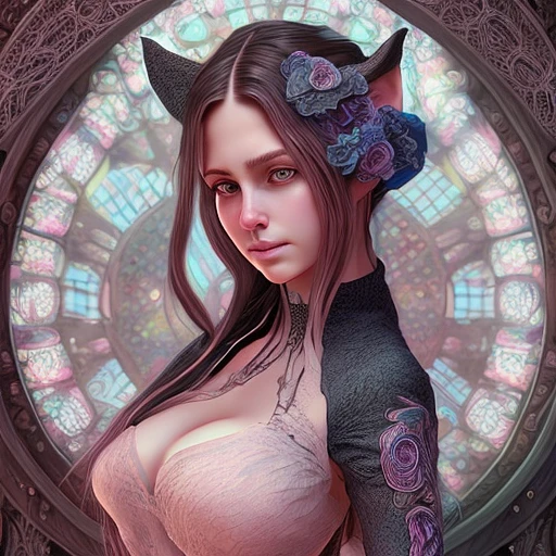 portrait of a highly realistic victorian cat female, formal portrait, calico cat face, clothes with intricate details, colorized, intricate colors, cinematic lighting, fairy tail style, fantasy style, Alphonse Mucha, Artgerm, Octane render, unreal engine