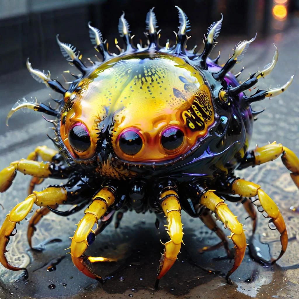 ferrofluid monster mixed between a crab and a wasp::5 on a new york street, tentacles, eyes on stalks, detailed iridescent, metallic, translucent, dramatic lighting, hyper futuristic, digital art Steps: 40, CFG scale: 8, width: 1024, height: 1024, Seed: undefined, Clip skip: 2, baseModel: SDXL
