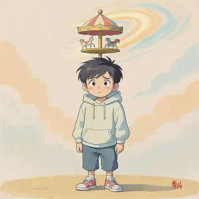 Scene 2 (5 s): carousel spins fast, hair moves, intrusive thoughts appear.
