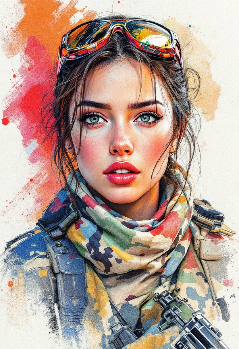 Sketch Art, Beautiful Colored Pencil Line Art, Artistic Brush Strokes, Beautiful, Emotional Female Soldier, Shoulders Open with Gun, Beautiful Portrait Style. Perfect Composition, Incredible Detail and Beautiful Rendering. Trending on ArtStation. 8k Fine Art Photo. Realistic Conceptual Art. Perfect Light in Natural Volumetric Cinematography. Soft Light and Shadows. Award Winning Photo. Masterpiece. Oil on Canvas. Raphael Caravaggio, Greg Rutkowski, Beeple Beksinski, Giger.