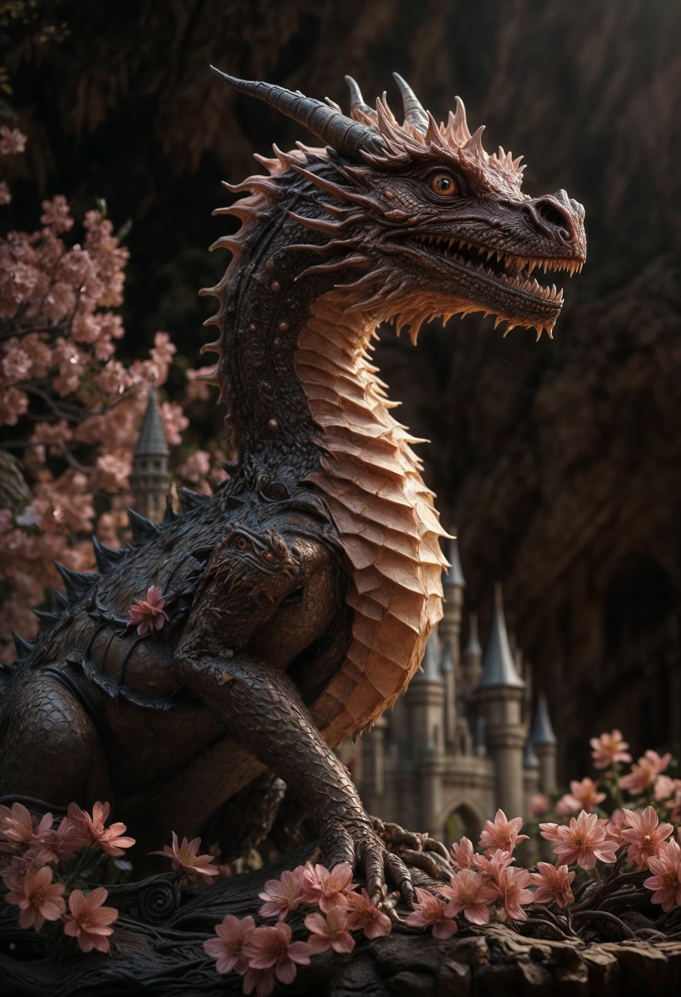 sunkissed action scene landscape lurking in shadows ultra detailed scales insanely detailed intricated chiaroscuro, complex lights and shadows, luminism, contoured, surrealism, castle, sky, close up cinematic dot oil masterpiece by Shaddy of a close up gracious iridescent giant transparent vivid ghostly happy dreamy dragon imp creature, filled with detailed tiny sakura flowers inside fully transparent body, expressive glowing spring insanely detailed, anatomical, unmaterial, looking in camera, sky, sleek, modern. , fairytale, fantasy, by Andy Kehoe, water drops, dynamic pose, tender, soft pastel colors, octane render, soft natural volumetric light, atmospheric, sharp focus, centered composition, professional photography, complex background, soft haze, masterpiece. animalistic, beautiful, tiny detailed