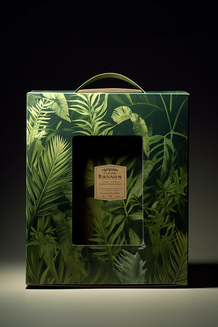 Package design, symmetry of a cardboard box, with a eco-friendly and sustainable label design, showcasing the recycled materials, by Tadanori Yokoo, using a neutral and earth-toned color theme, inspired by the lush rainforest, symmetry, with a paper-cut background:3 --v 5. 2 --ar 2:3
