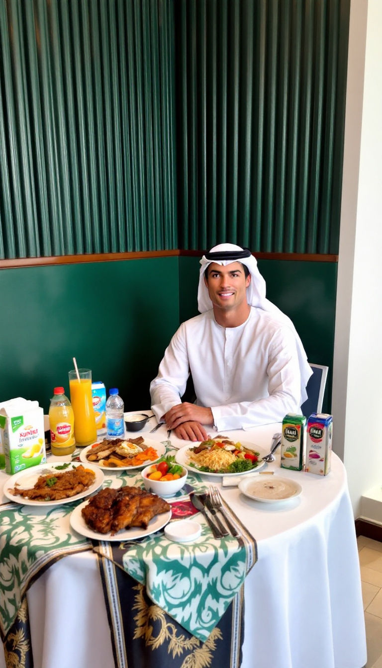 Cristiano Ronaldo sits at a round dining table in a stylish, modern restaurant, dressed in traditional Gulf attire, wearing a crisp white "thobe" and a neatly arranged white "ghutra" secured with a black "agal." His hands rest naturally on the table as he prepares to enjoy an exquisite selection of authentic Kuwaiti and Arabian dishes. The table is covered with a decorative green and white tablecloth featuring the restaurant's logo, filled with beautifully arranged Gulf cuisine, including Chicken Mandi and Lamb Mandi with tender, slow-cooked meat over fragrant spiced rice, grilled chicken with a smoky aroma, traditional sides like yogurt, spicy tomato sauce, fresh Middle Eastern salads, and beverages such as fresh orange and mango juice, along with bottled water. Additional items like branded potato chips and dairy drink cartons are also present. The stainless steel cutlery is neatly arranged, though the communal dining style encourages eating by hand, emphasizing tradition and hospitality.