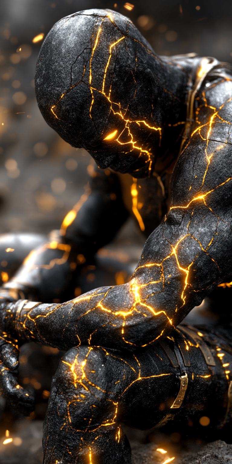 Midjourney prompt: Black stone golem, with golden cracks on its body ...
