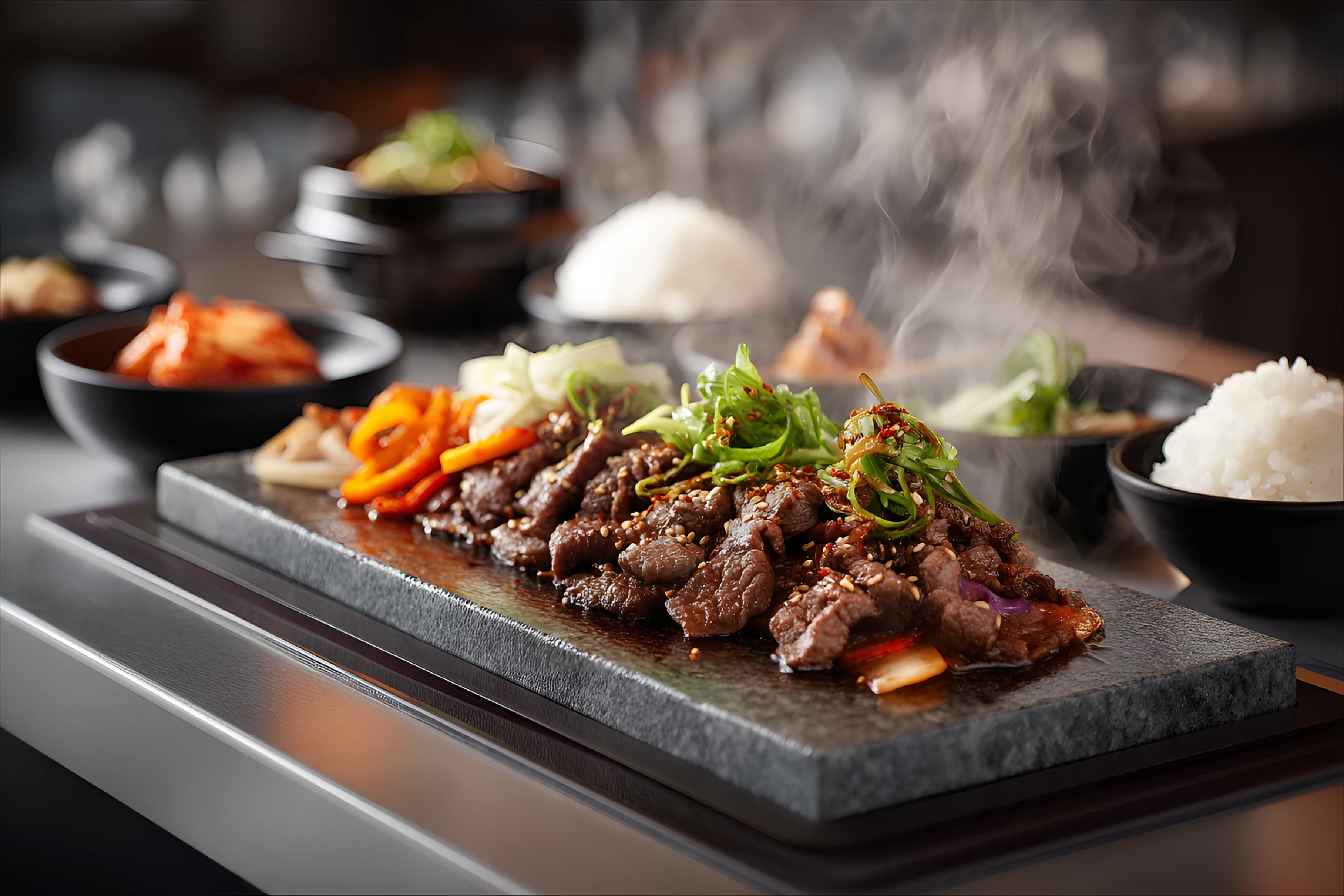 delectable plate of beef bulgogi on a sizzling hot plate, served with steamed rice and Korean side dishes, presented on a sleek granite countertop. The thinly sliced beef is marinated in a sweet and savory soy sauce mixture, then grilled to perfection with onions and bell peppers. The countertop includes small dishes of kimchi, pickled radishes, and sesame seeds, set against a backdrop of modern Korean kitchenware and vibrant colors