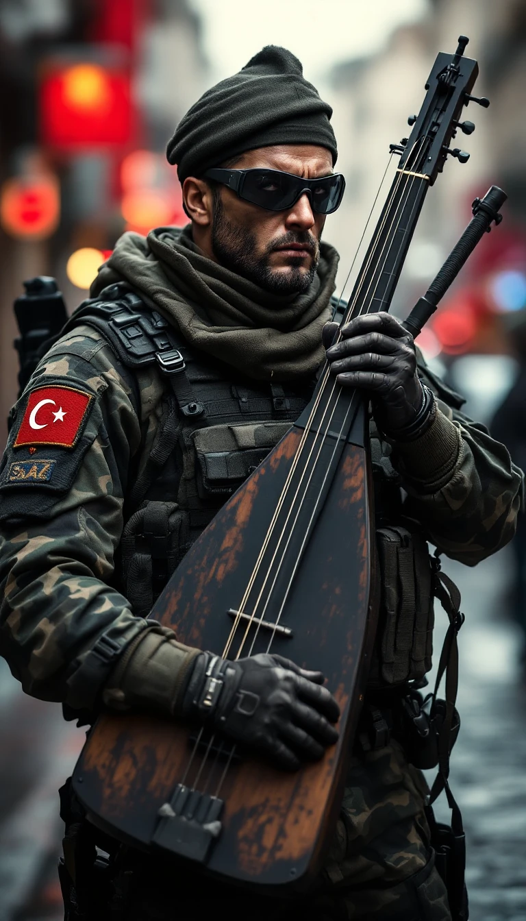 /imagine prompt: A fierce, modern Turkish soldier dressed in advanced military tactical gear, with camouflaged fatigues and a Turkish flag patch on his right shoulder. Instead of holding a rifle, he is gripping a saz, a traditional Turkish stringed instrument, in both hands. The saz is prominent, detailed, and the focus of the image. The background shows the urban streets of Istanbul, cinematic lighting, sharp focus, high detail --ar 85:128 --v 6. 0 --s 250